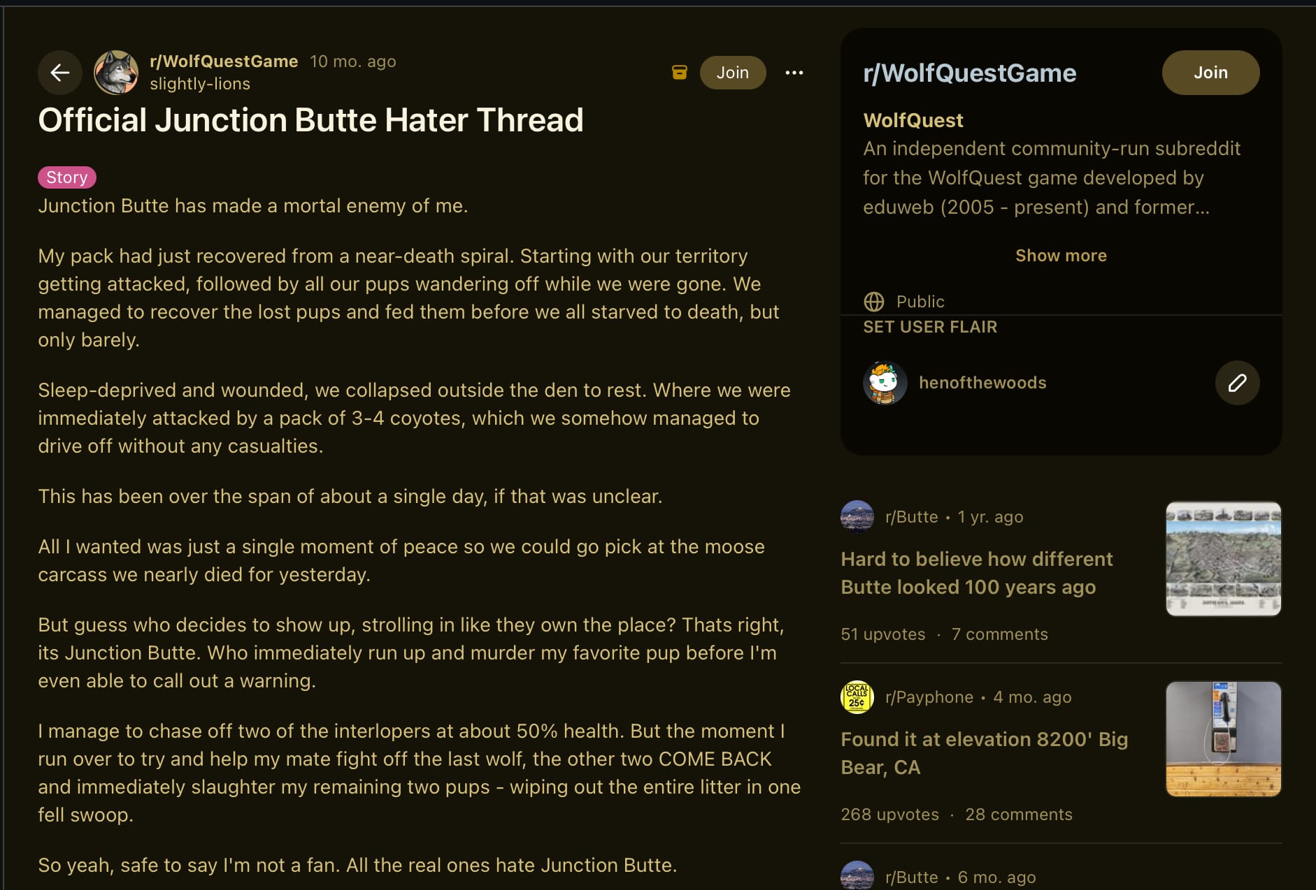 Sadly, 907F, the oldest wolf in Yellowstone, actually died earlier this year after sustaining injuries from a rival wolf pack. Keeping up with the wolf packs is basically a wildlife reality show… while I was there the big gossip was that an unknown interloper stole a pup from the Junction Butte den, which is only a mile from the road and the easiest to observe of the wolf packs in Yellowstone. And TIL that Yellowstone wolf drama is so complex that it actually inspired an educational game with its own active and dedicated longtime subreddit, which leads to incredible wolf roleplaying moments like this, apparently.