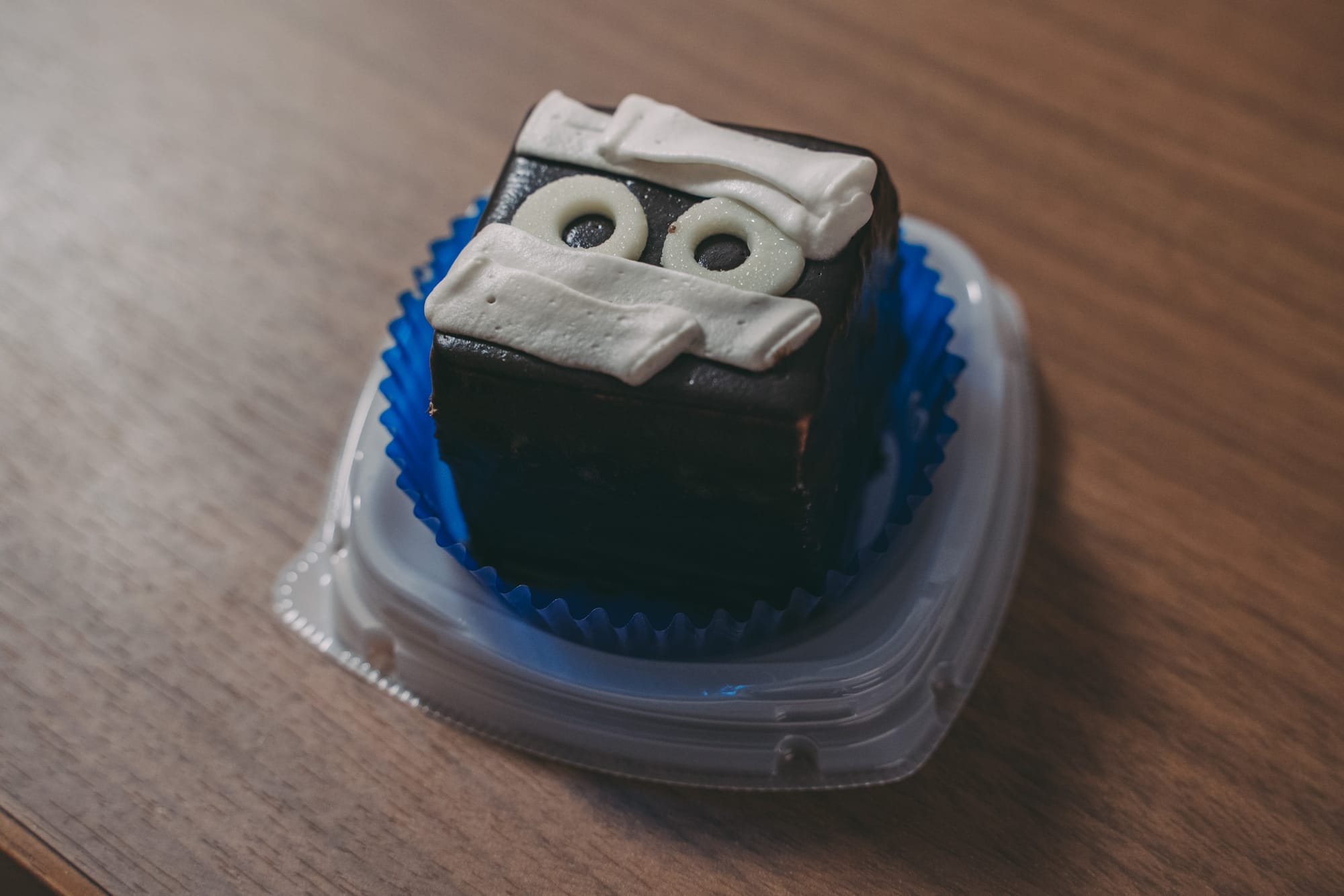 Another mysterious challenger approaches, this time one inscrutable to the Western mind, or to me at least. I didn’t know what this design meant before translating the text on the wrapper and apparently it’s a mummy! I have yet to make sense of this on a cultural level (please write in if you can) but it was still fun and different and the perfect little portion. This one is clearly a black cake, no mysteries there, but it truly added up to more than the sum of its parts. Delicious, chocolate mousse-y, perfectly sized with a nice thick, super sweet icing and yellow cake layers inside. Would enjoy this at a restaurant. Excellent and apparently a mummy 10/10